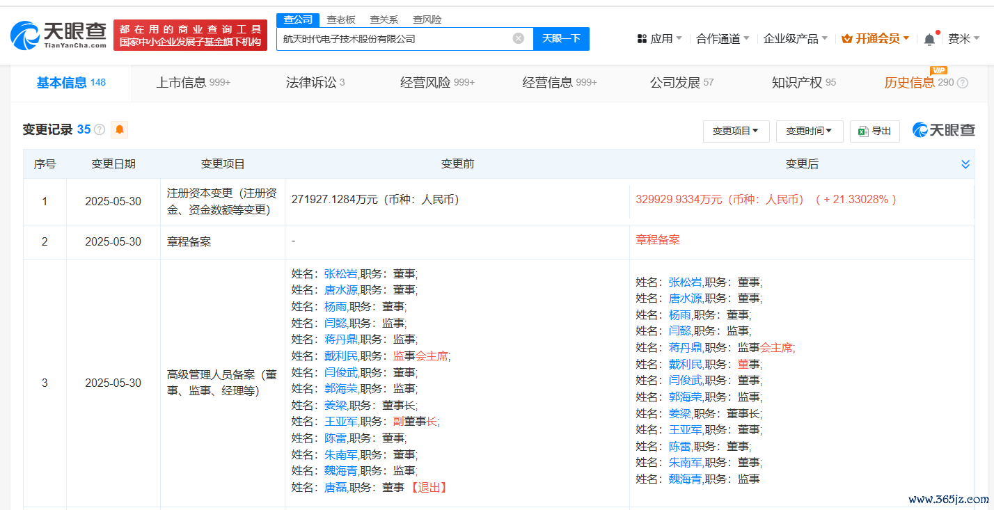 南方财经6月4日电,天眼查App显示,近日,航天电子(600879)发生工商变更,注册资本由约27.2亿人民币增至约33亿人民币,增幅约21%,同时部分高管发生变更。航天时代电子技术股份有限公司成立于1990年7月,法定代表人为姜梁,经营范围包括本企业和所属企业产品出口业务,经营本企业的进料加工和“三来一补”业务,承揽电子系统和产品的电磁兼容、环境试验等,由中国航天时代电子有限公司、国开制造业转型升级基金(有限合伙)、中国时代远望科技有限公司等共同持股。