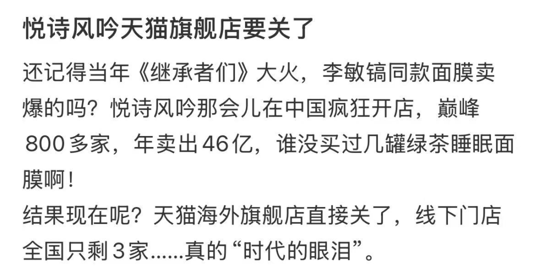 据悉,自2020年起,悦诗风吟在中国市场开启“瘦身”模式:2020年关闭90家亏损门店,2021年单年撤店170家,彼时门店数量从800余家锐减至140家,撤店率超80%。