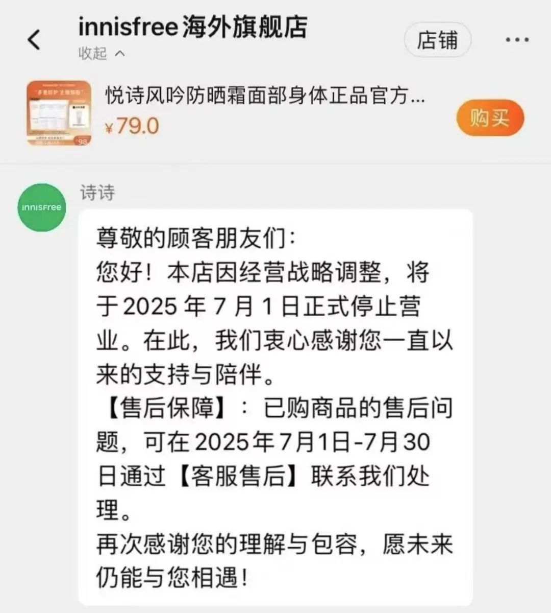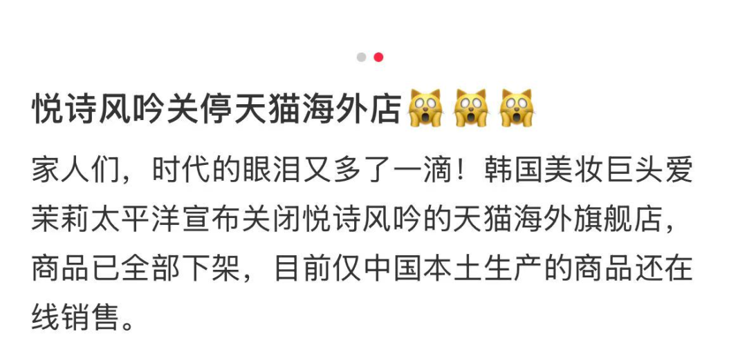 近日,韩国美妆巨头爱茉莉太平洋旗下品牌悦诗风吟(Innisfree)宣布7月1日起关闭其天猫海外旗舰店。